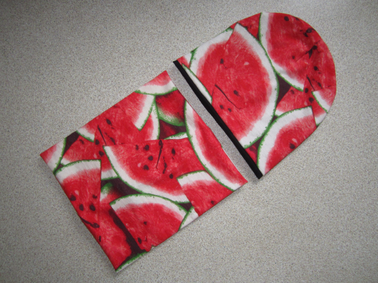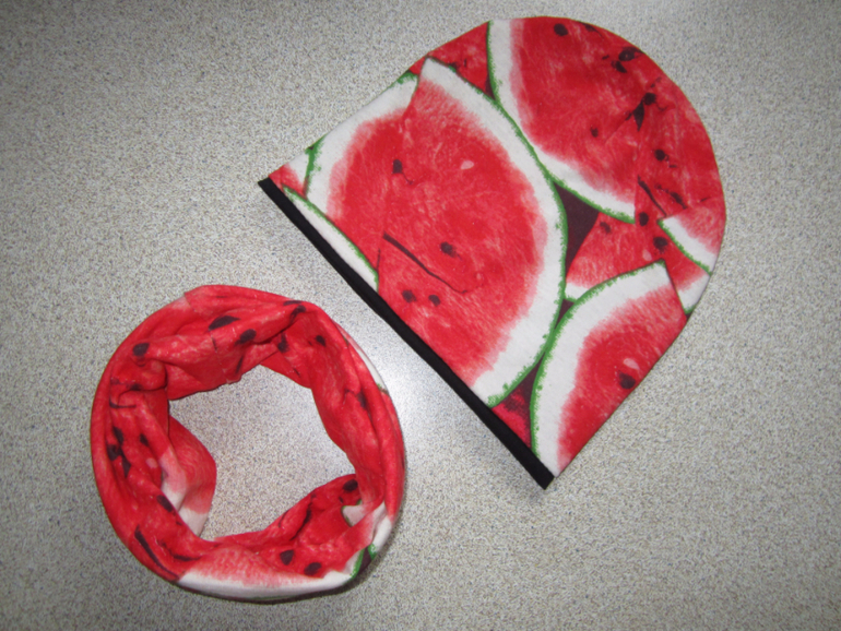 Шитье одежды, выкройки, ремонт одежды, шторы, швейные машины (уже приобретенные)Яркий, сочный комплект с арбузами. Выполнен на обхват головы 44 см. Хлопок 100%.