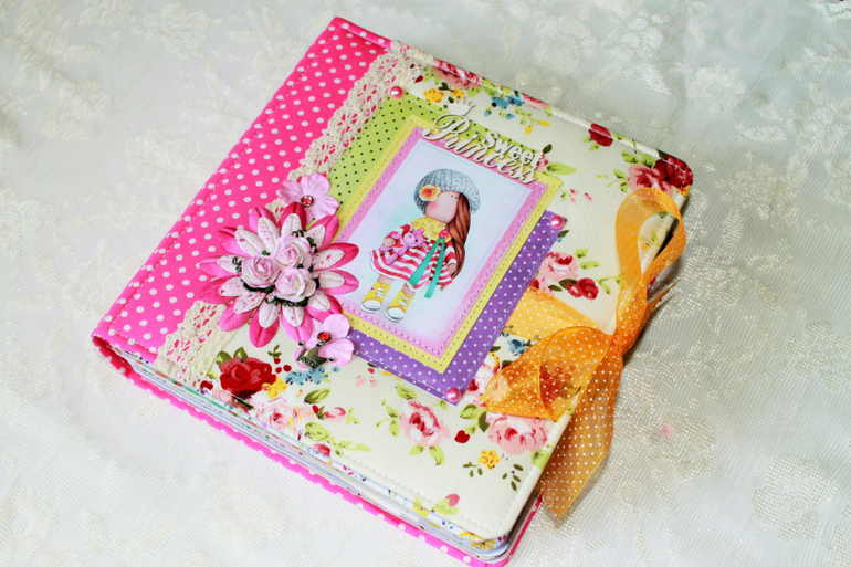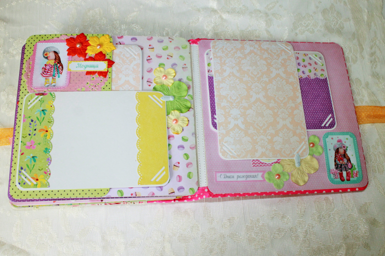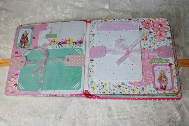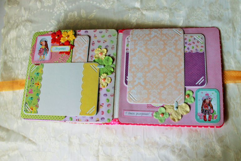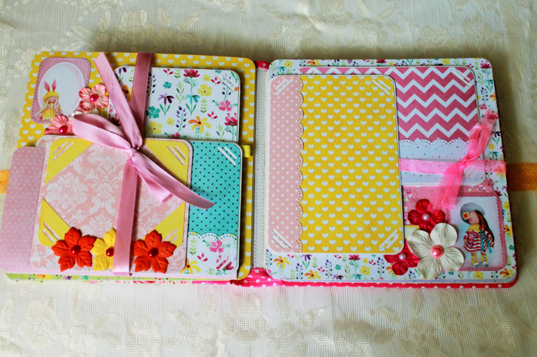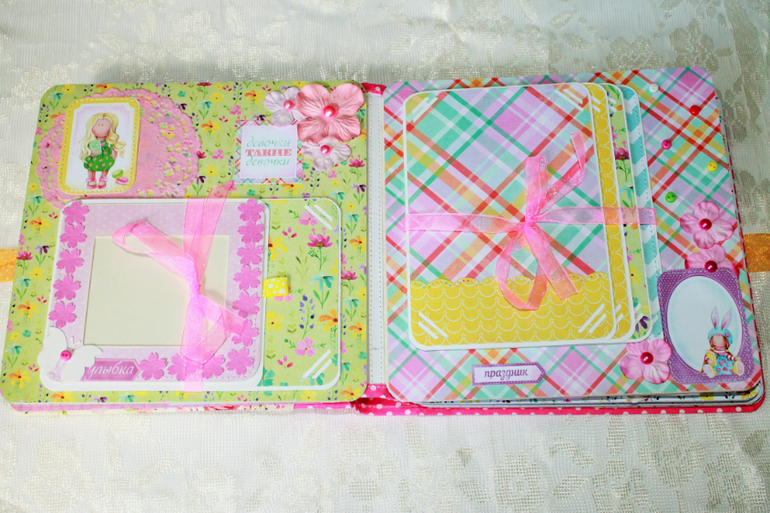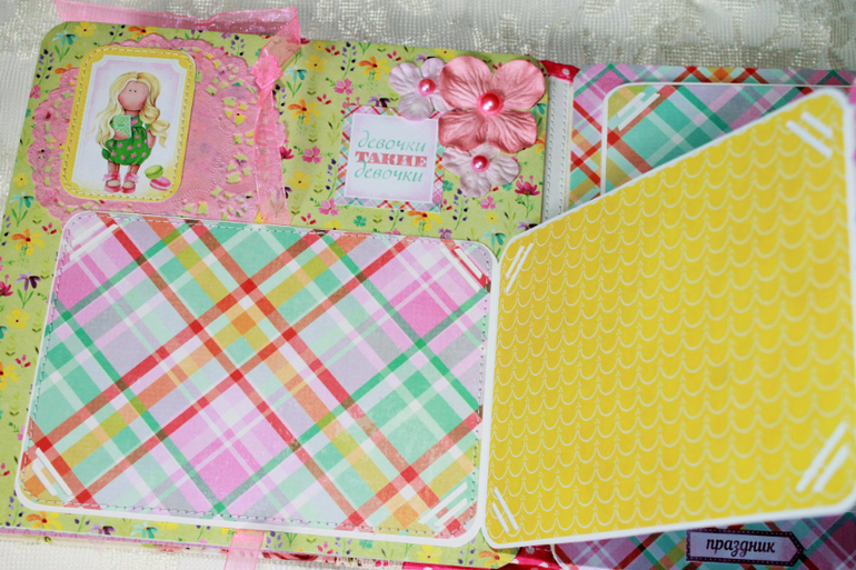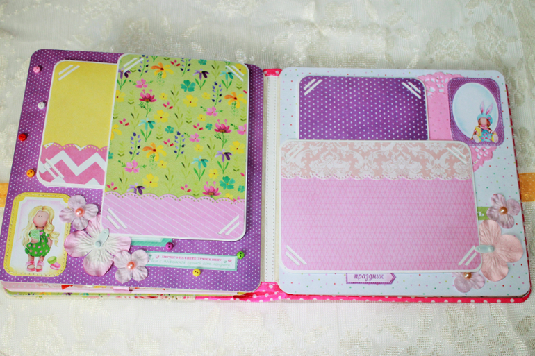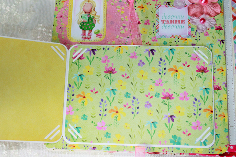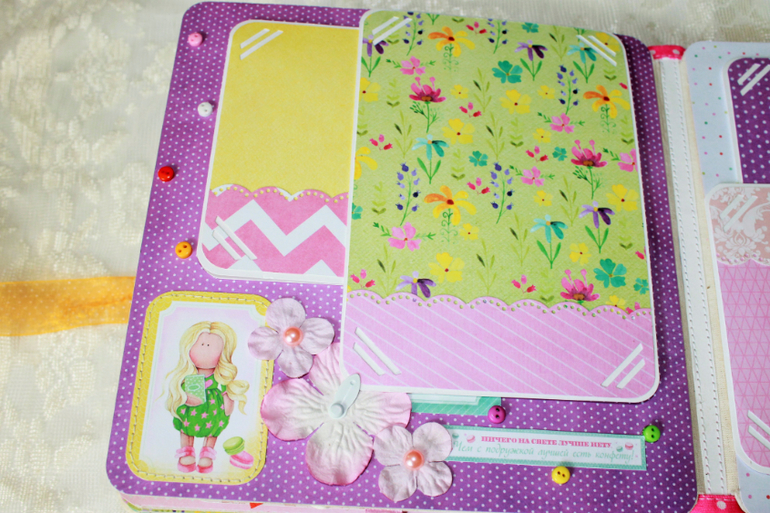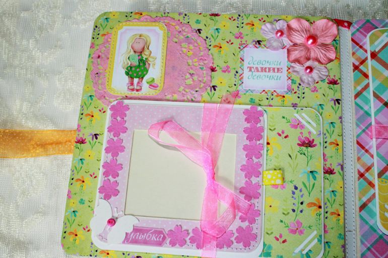 СкрапбукингПокорила меня бумага от СкрапМира "Sweet Girls", яркая, цветочная с куколками - большеножками... Альбом родился на одном дыхании. Размер 20*20 см, 5 разворотов... Вмещает более 50 фото + есть кармашек для дополнительных фото или записочек