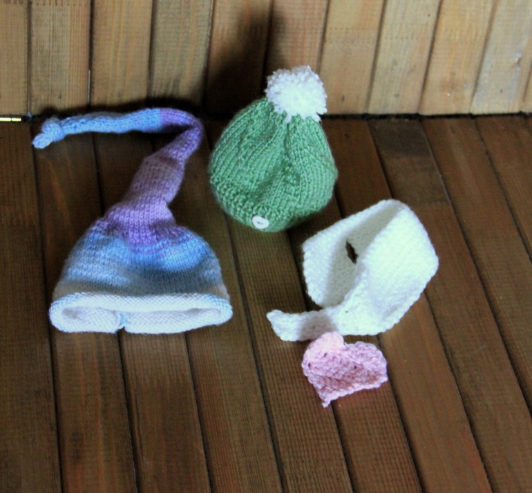 Прелестные шапочки на тедди, еще есть косынка вязаная. Но Надя ее утащила, экспроприировала для своей плюшевой улитки со словами "Надо делиться". И я не смогла сфотографировать ее...