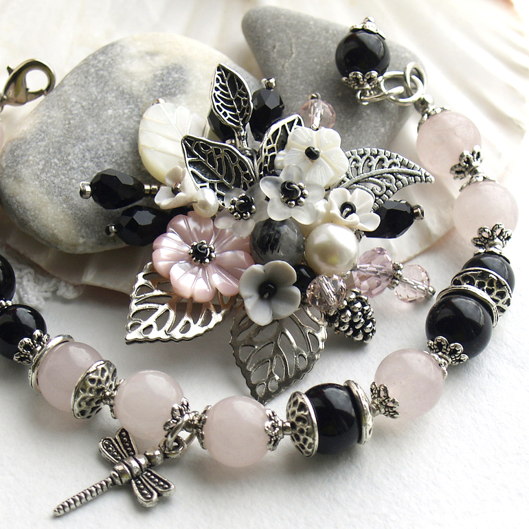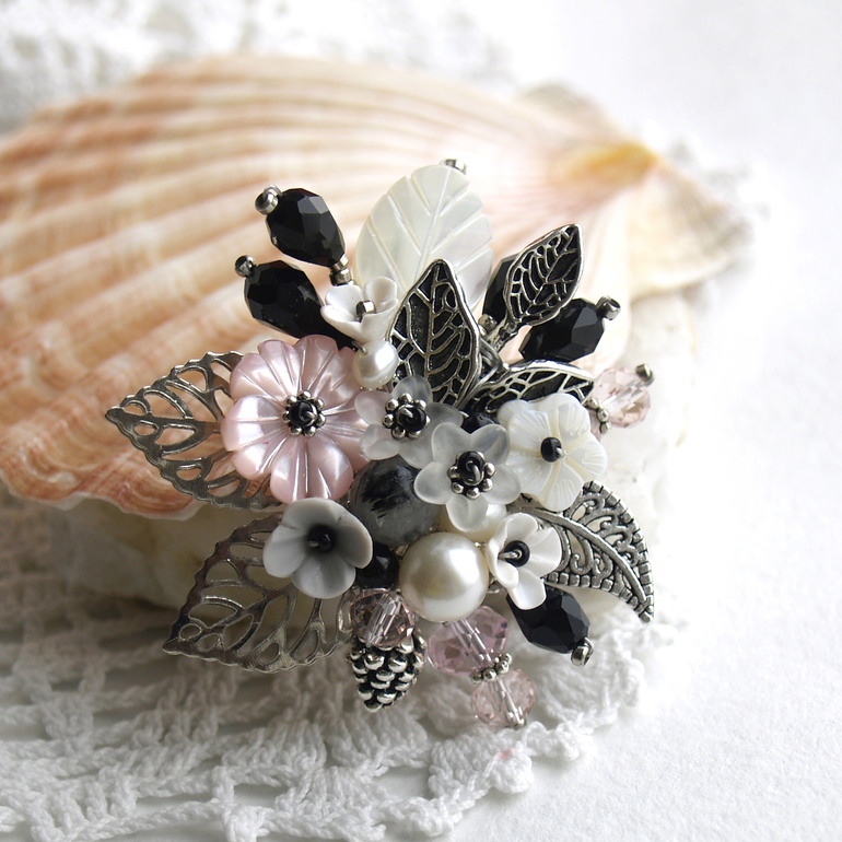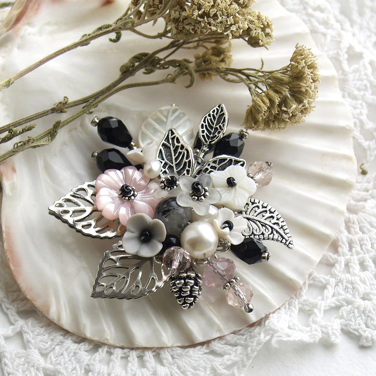 На этот раз я собрала брошь в нейтральных и столь любимых оттенках серого, светло-розового, жемчужного. Для контраста и выделения акцентов добавлен черный.