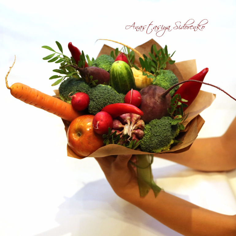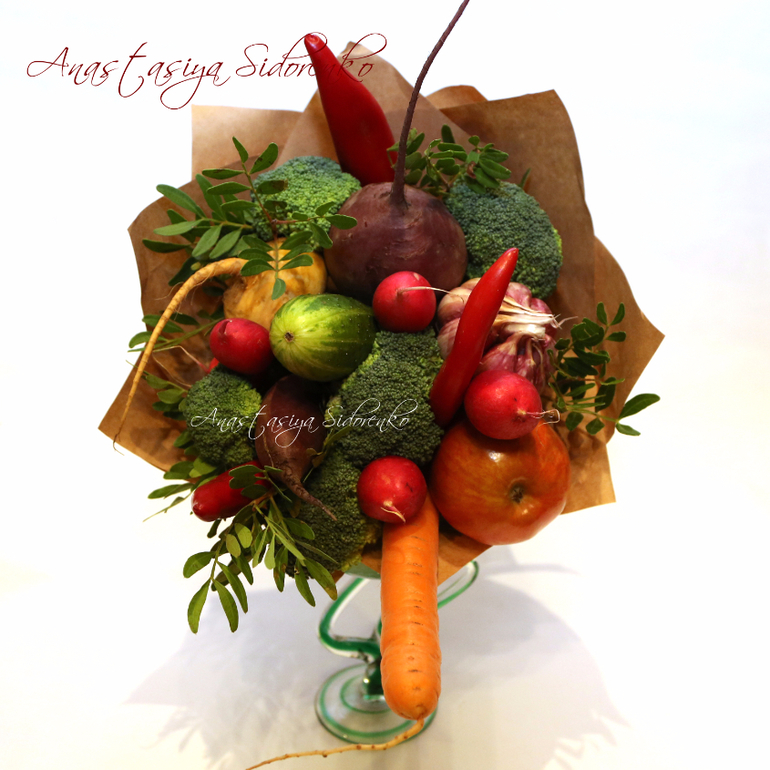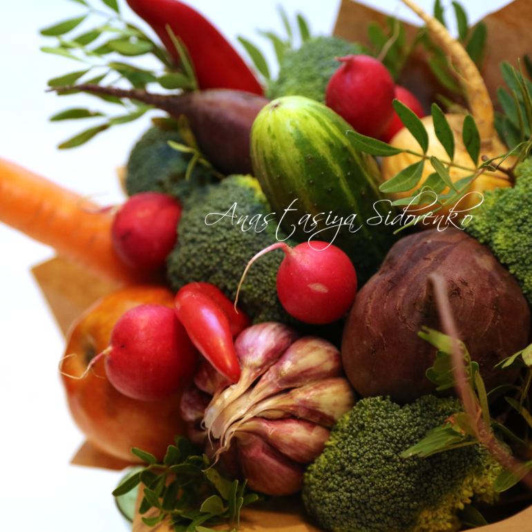 Букеты из овощей размер S и М в составе: свекла, огурец, морковь, чеснок, перец, брокколи, яблоко, редис, репа.
