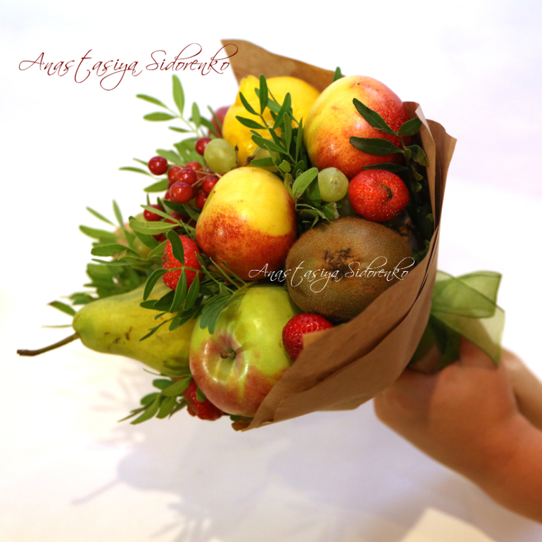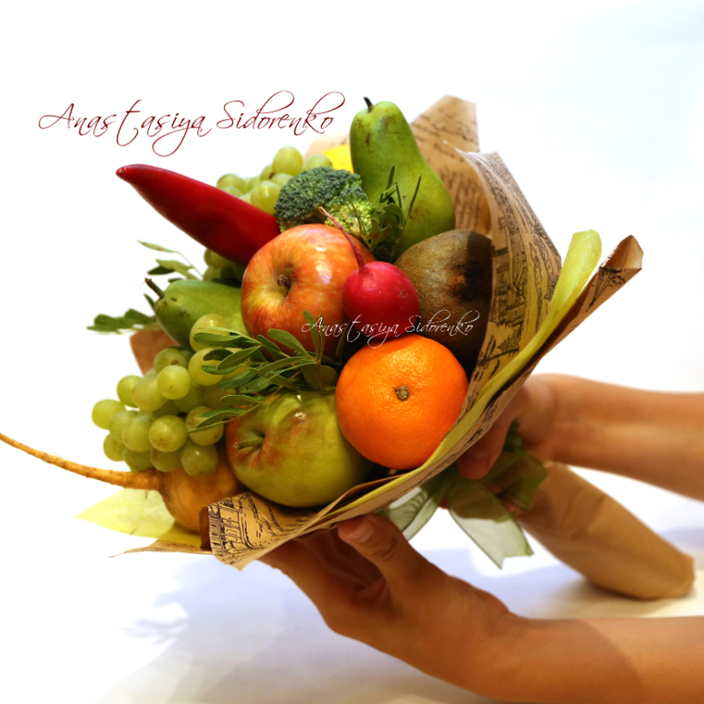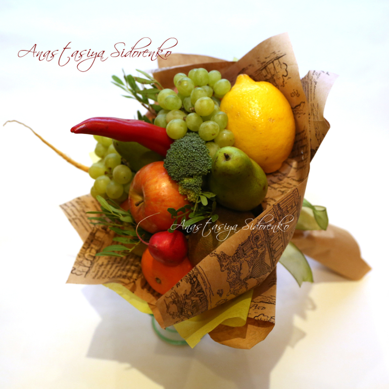 В этом году я решила воплотить в явь давнюю мою задумку и сделать наконец не только конфетные букеты к 1 сентября, но и букеты из овощей и фруктов!