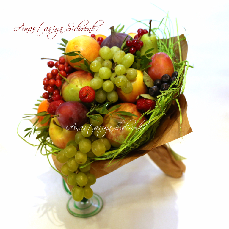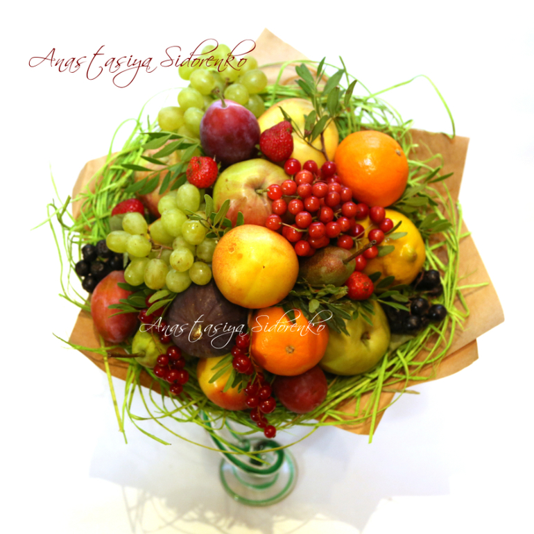 Мы дарили в корзине букет из фруктов доктору) но, в корзине все понятно)) а тут все так сложно))