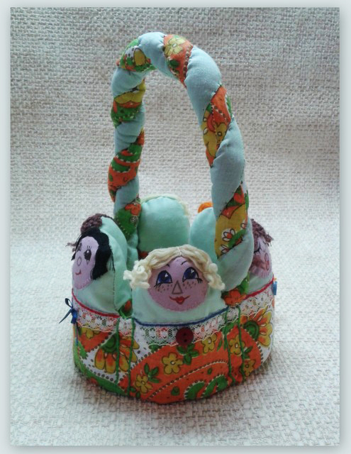 Вот такую веселую корзиночку я сделала подруге- рукодельнице в подарок. Может, понравится. Теперь с разных сторон.