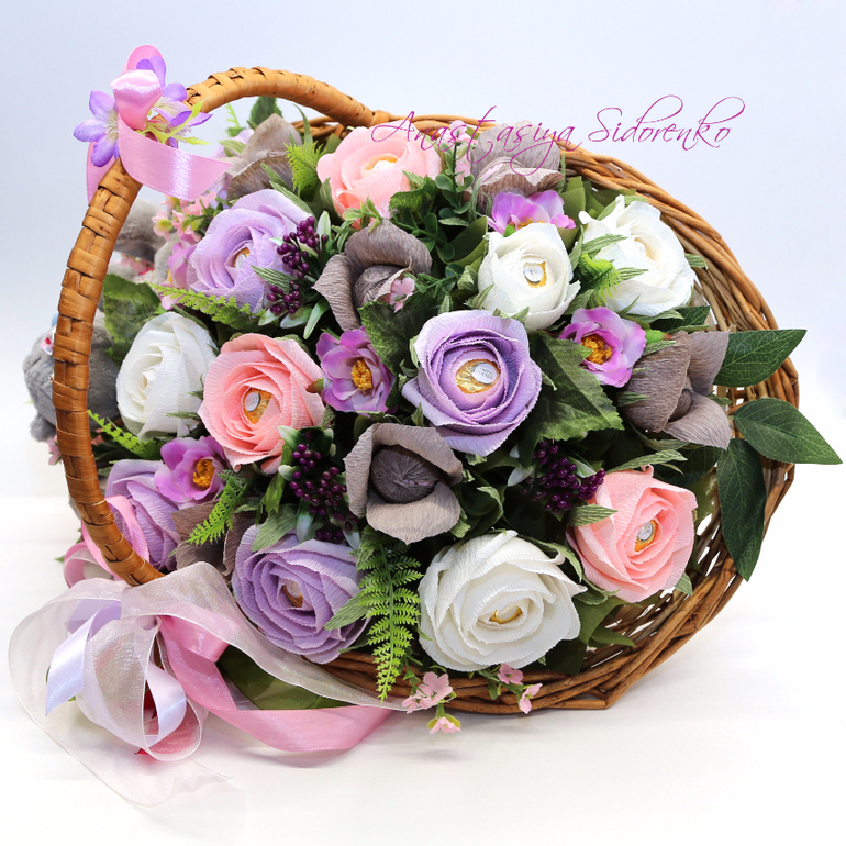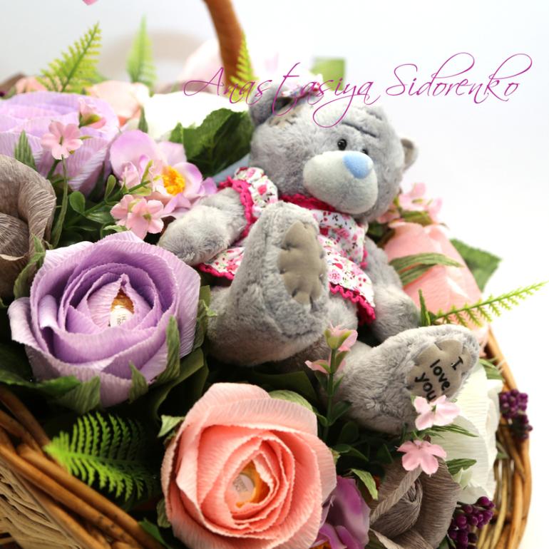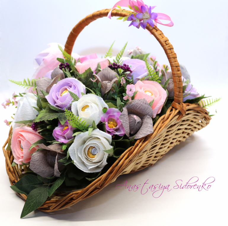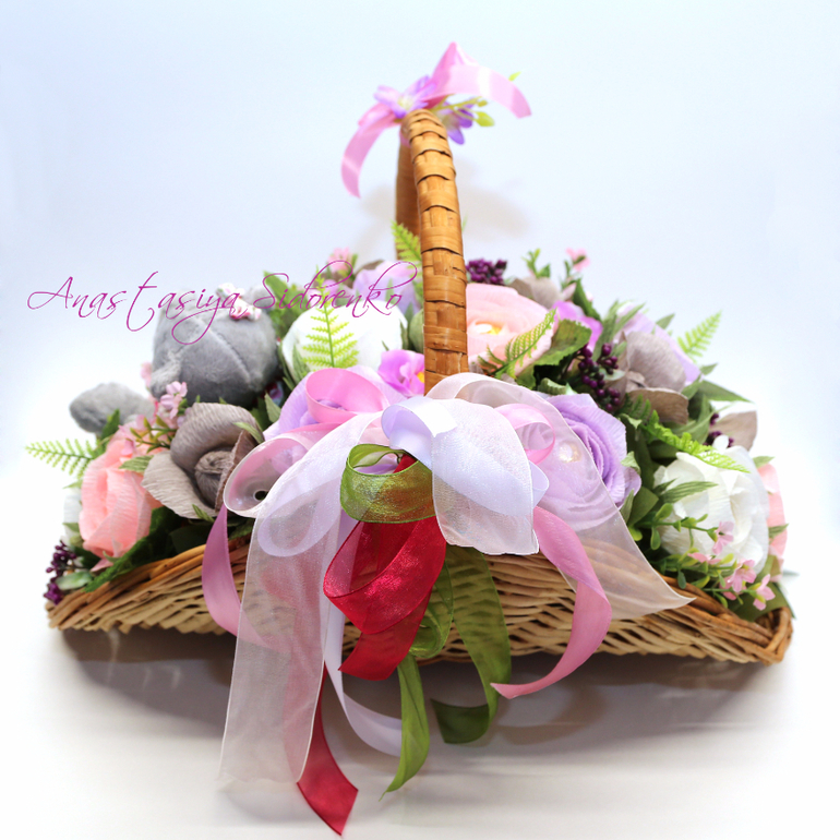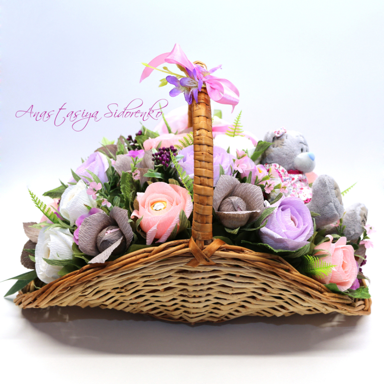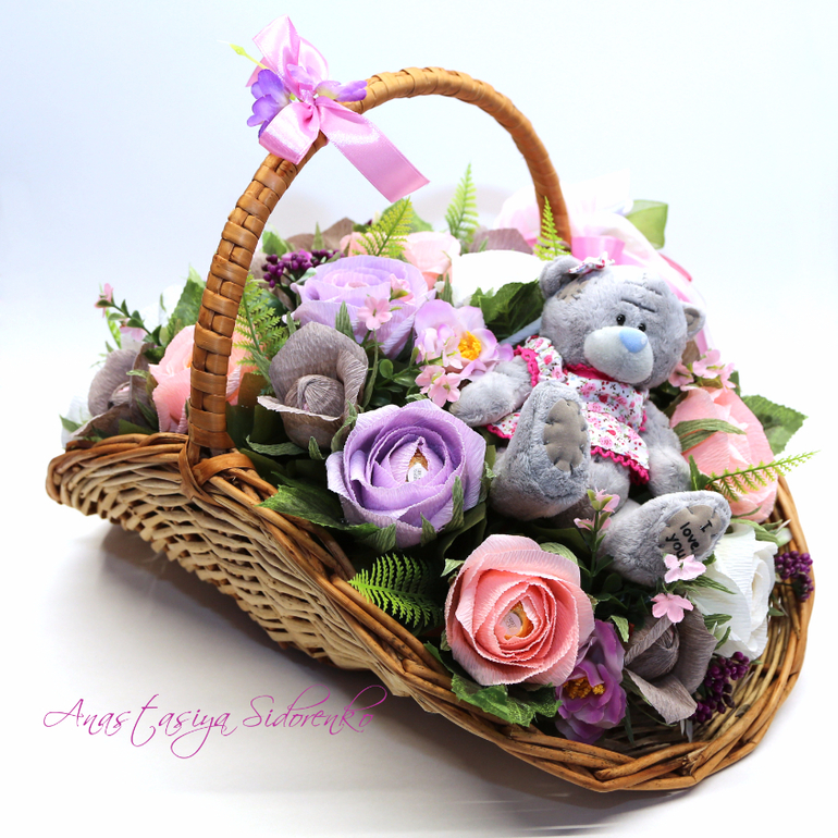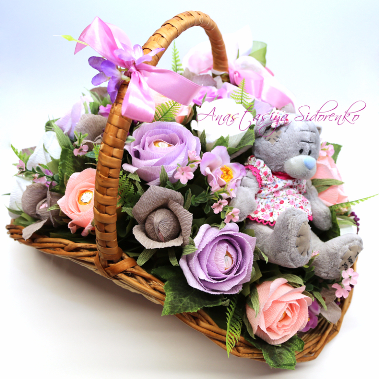 Букеты из конфет. Свитдизайн.Давилось мне в выходные изготовить чудесную корзинку с розами и мишкой, для маленькой именинницы!