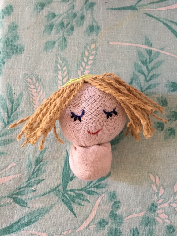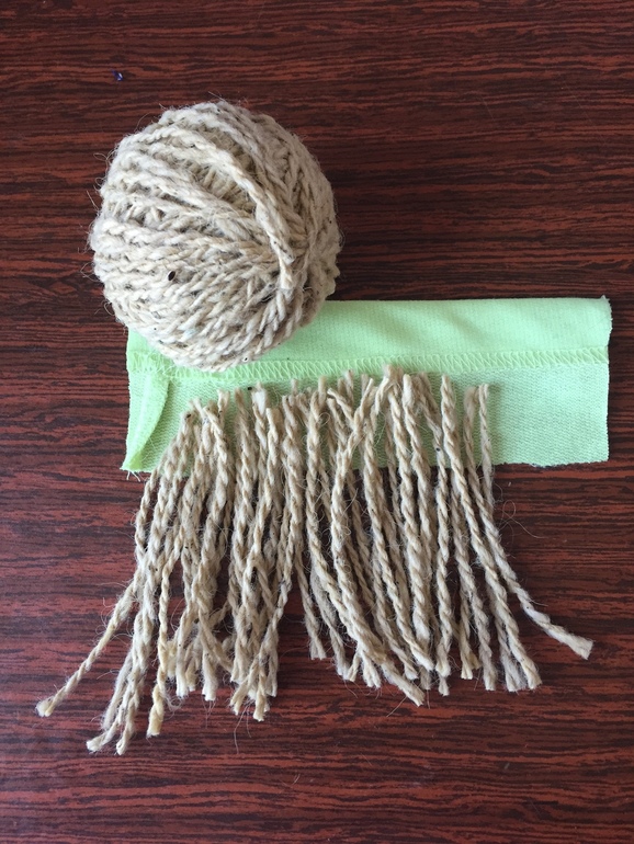 Далее делала волосики. Небольшие кусочки шерстяной нитки положила на трикотаж.