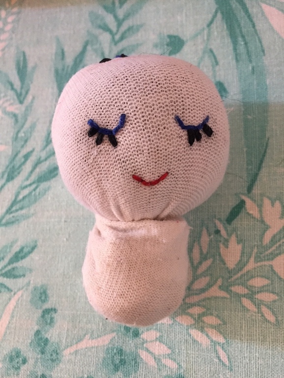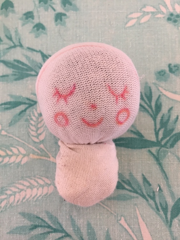 Косметическим карандашом нарисовала носик и румяные щечки на лице куколки, размазала ватной палочкой.