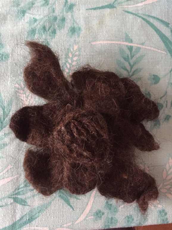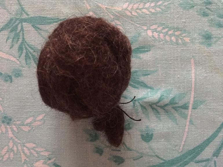 Затем приступила к голове. Голова должна составлять 1/3 от туловища игрушки. Взяла небольшой клубок своих (имею в виду самостоятельного изготовления, не магазинных) шерстяных ниток, разложила высохшие кусочки шерсти звездой, обернула вокруг клубка.