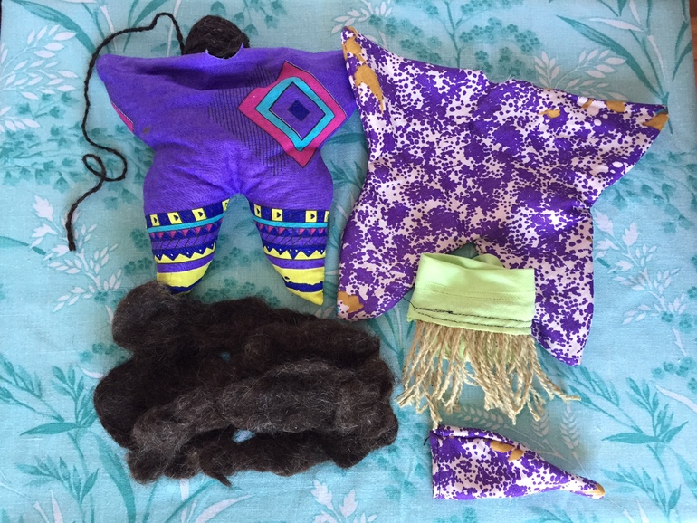 Из обработанной шерсти сформировала несколько маленьких кусочков для бубончиков. Набила ими концы ручек и ножек комбинезона, крепко завязала каждый получившийся бубончик ниткой. Обработала также края горловины как "тела", так и одежды куколки. Засунула "тело" в комбинезон для последующего набивания косточкой.
