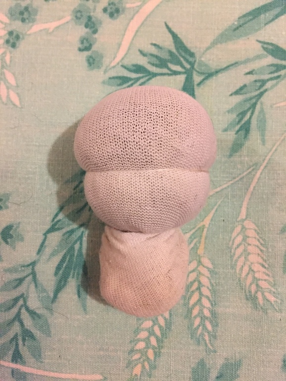 Шить начала с "тела" куколки. Вырезала ткань по выкройке без запаса, сшила. На фото набила косточкой, но лучше не спешить делать это.