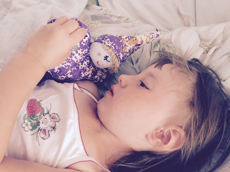 Куколка получилась немного тяжёленькой, но нежной, да ещё и ароматной. Дочка назвала игруху Илюшей, и поселила в своей кроватке.