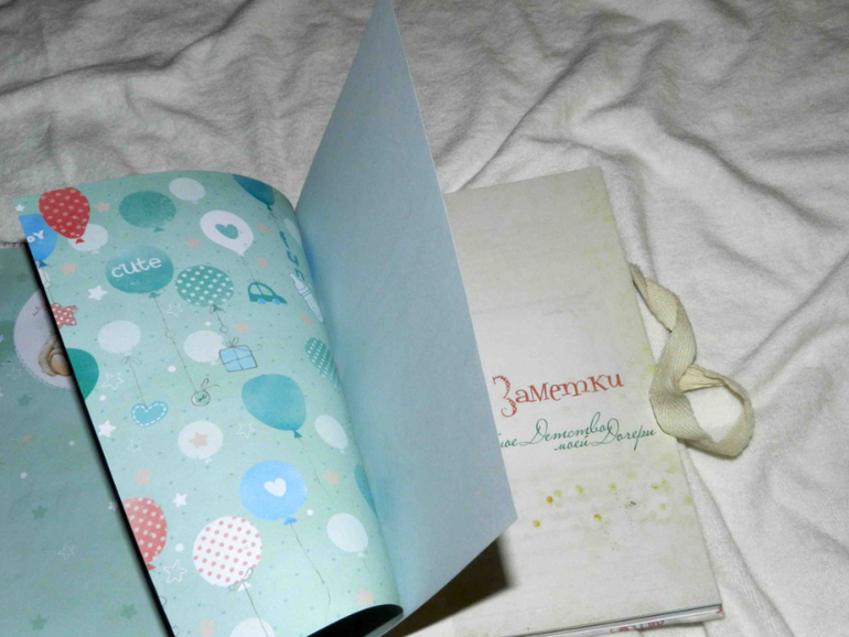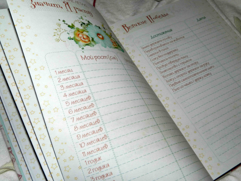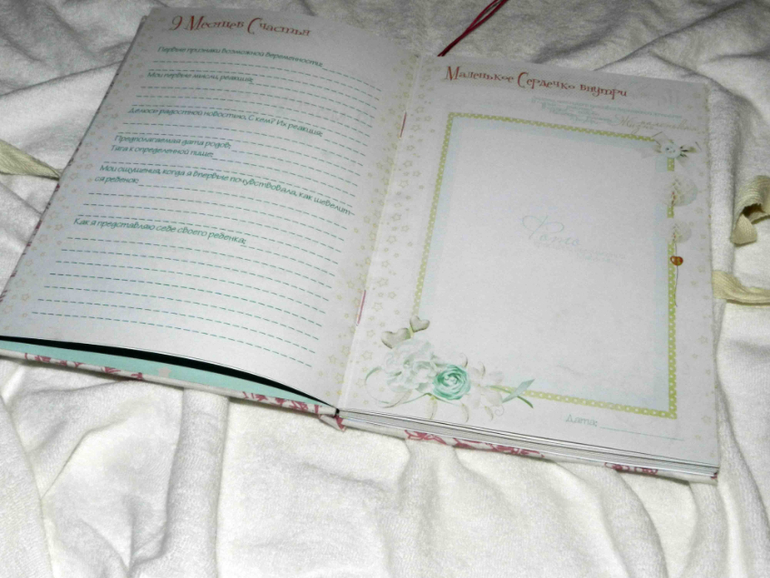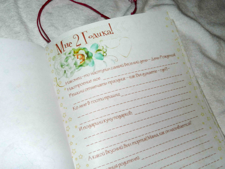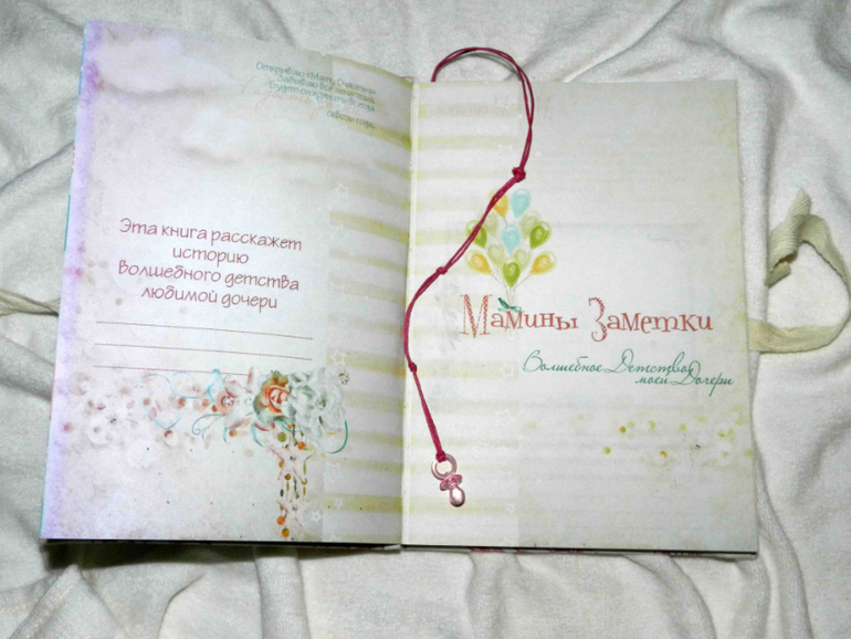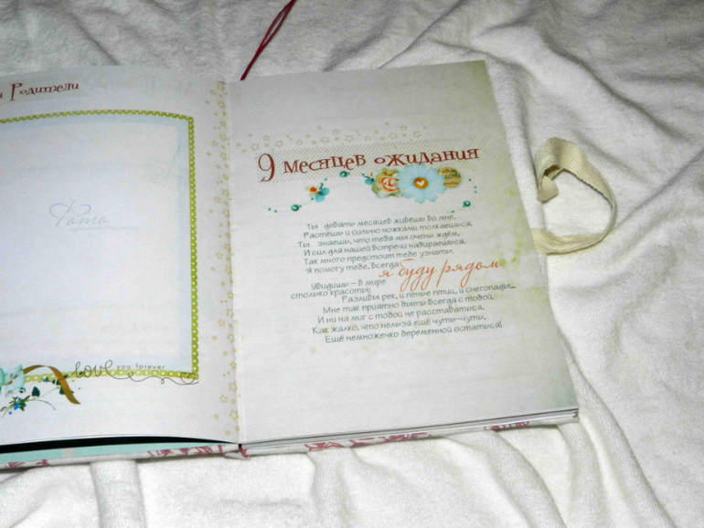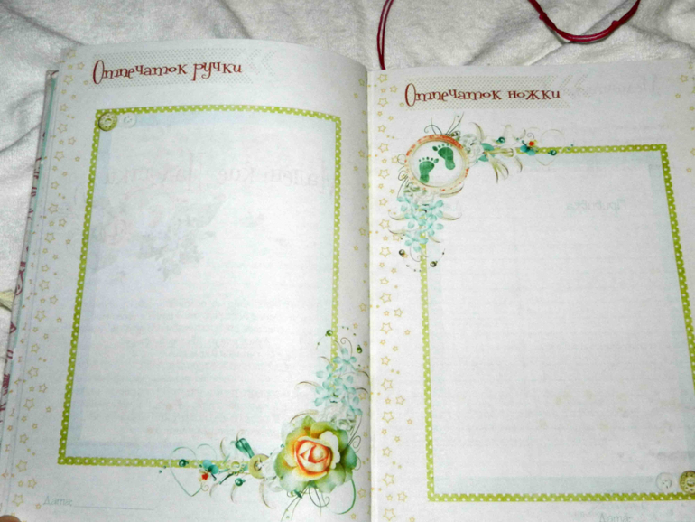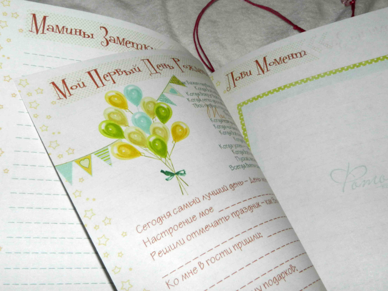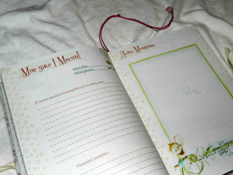 Внутри мои любимые странички, которые сохранят мамины воспоминания от времени ожидания Чуда до того момента, как Чудо пойдет в школу)))Первый год-есть странички с достижениями по месяцам, далее с года до 7 лет. Есть место для вклеивания узи, 29 фото, семейное дерево, места для отпечаточков ручек-ножек, для первого рисунка, записи о росте-весе.о зубках. Милые цитаты и стихотворения! Ну и фото!