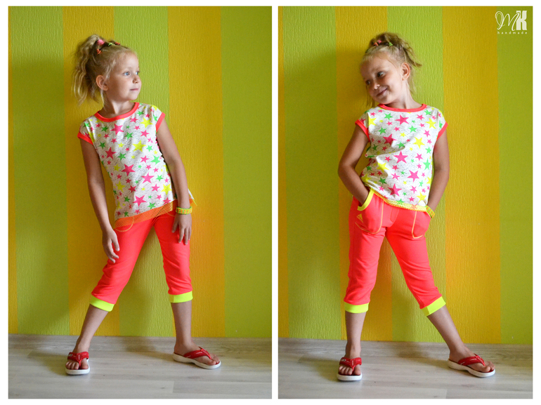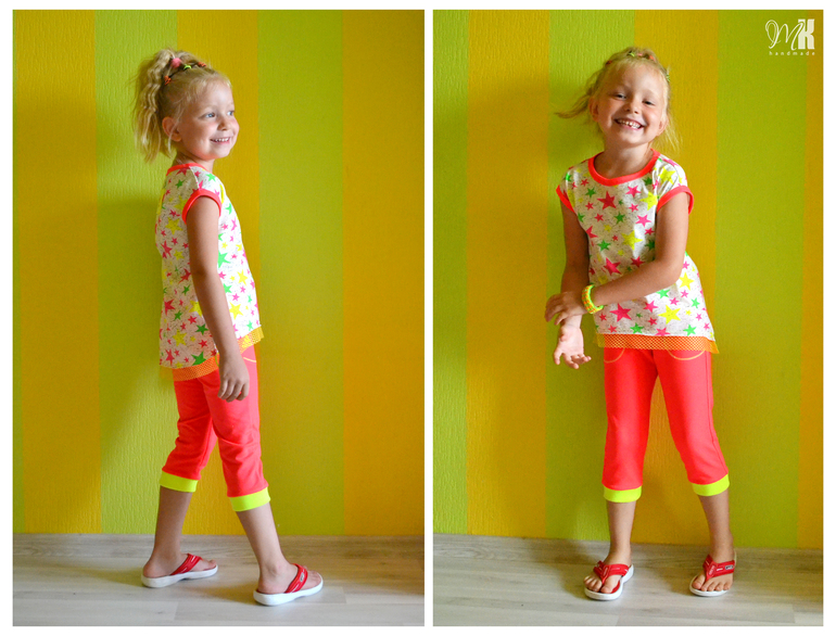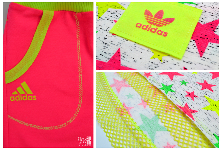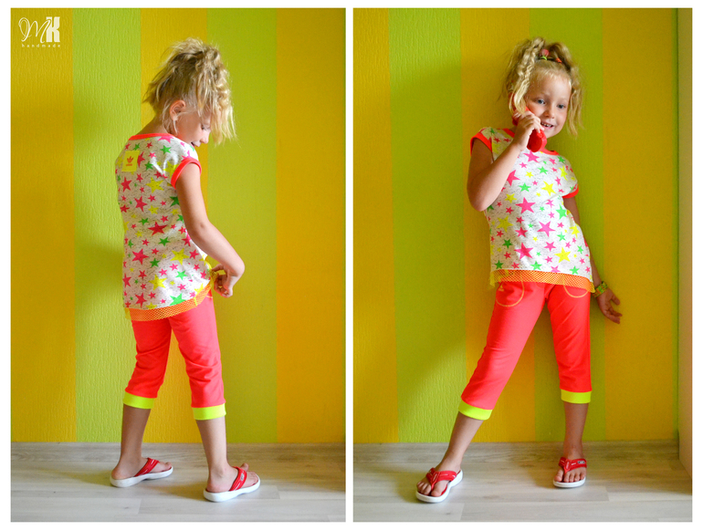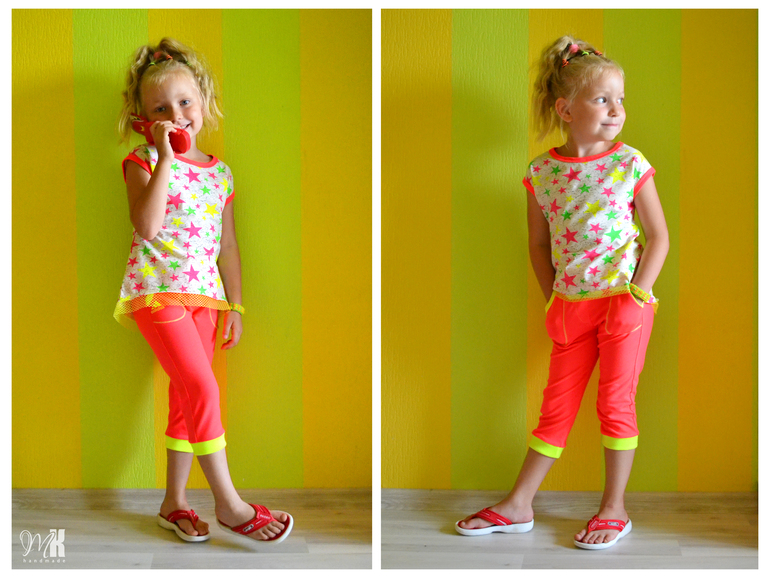 Брюки из ярко-розового футера с/л, отделка - ярко-желтое кашкорсе с/л. (шнурочек на тот момент еще не приехал, на фото - временный неоново-оранжевый, теперь, уже в цвет брючек)