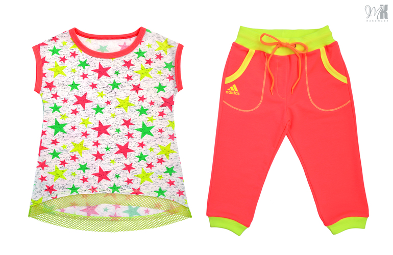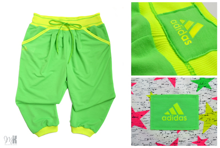 Брюки из ярко-салатового футера с/л, отделка - ярко-желтое кашкорсе с/л.