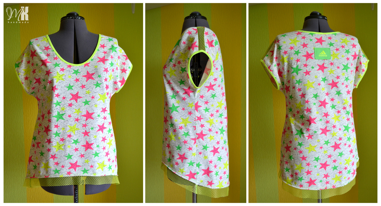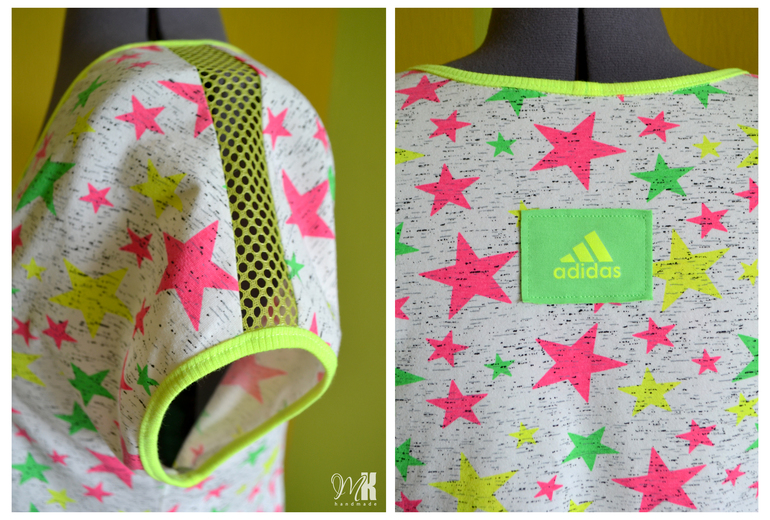 Топ из звездной кулирки с/л, отделка - ярко-салатовое кашкорсе с/л и сетка.