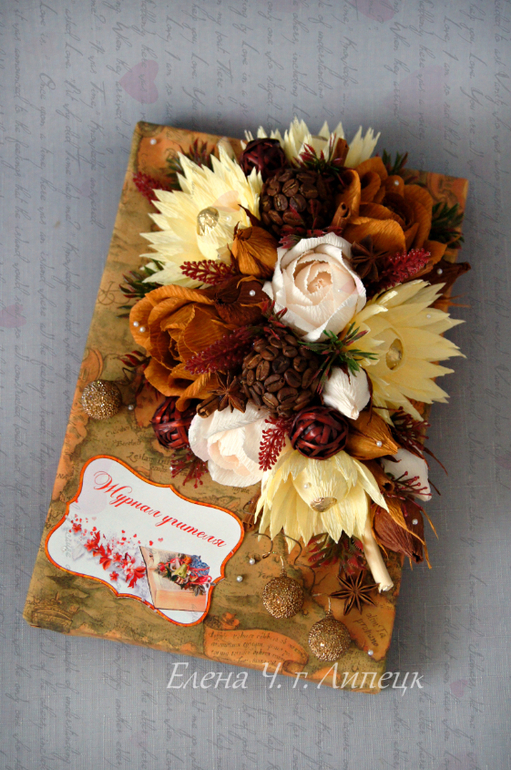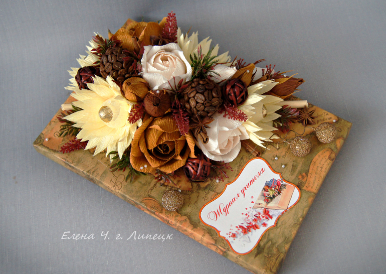 Спасибо, Нин!! Мне самой больше всего кофейный журнальчик понравился. Не часто мною используемая гамма и тема кофе и корицы. А тут тон задала обычная обертка журнала. Эт мы кстати классной своей понесем, она у нас географичка.