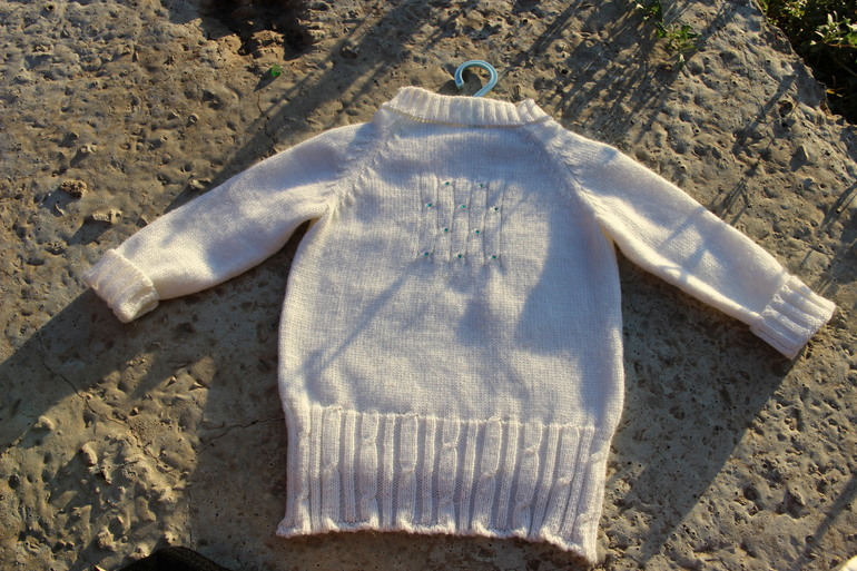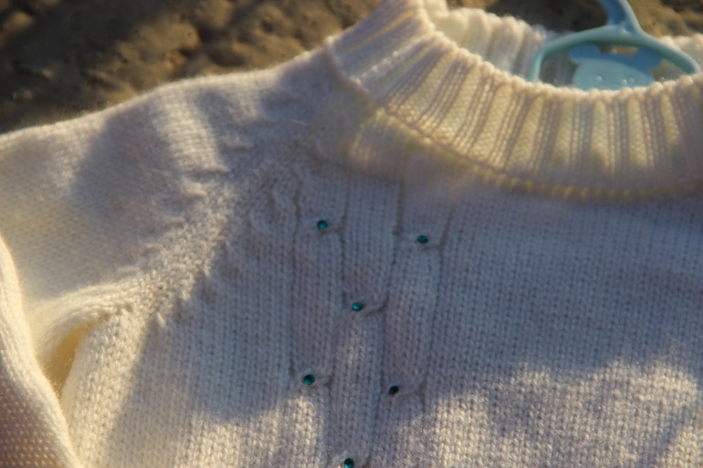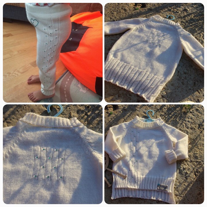 свитер с удлиненной спинкой и с декором из страз и кос на спине, и на передней полочке декор из кос, который повторяется на гамашах. Вот такой теплый лук для принцессы!!!