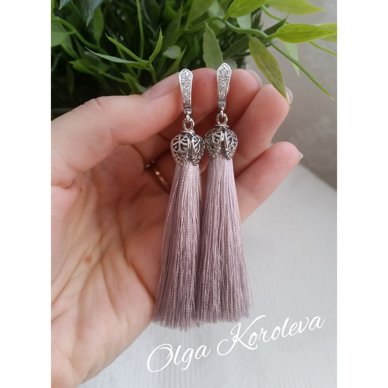 Бижутерия для слингомам. Слингобусы. Грызунки.Когда увидела эти шелковые кисти, мимо пройти не смогла. Благородный серыц цвет и легкими шелковыми переливами... И сразу родились серьги! Основа с посеребрением и цирконами, английский замок.