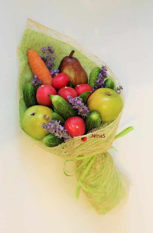 Таак ... такое чудо еще не показывала вам, не ругайте меня модераторы))) Фруктово-овощной букет. Ну что не соберешь, если у тебя дома флорарсенал. Для подруги был букетик.