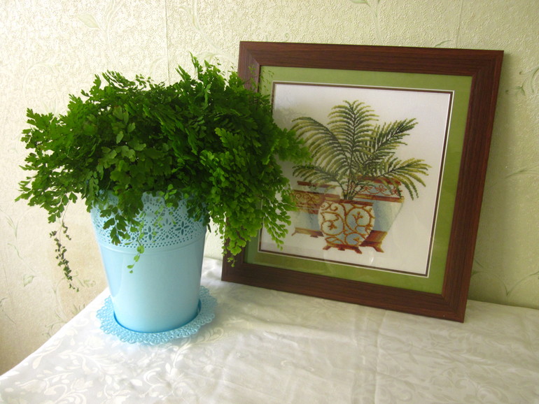 Кокосовую пальму никогда не видела, но на картине она похожа на нефролепис. Нефролеписа у меня пока нет, сфотографировала с другим папоротником.