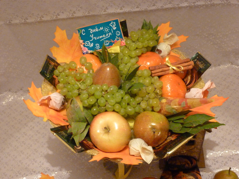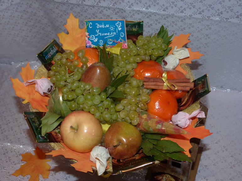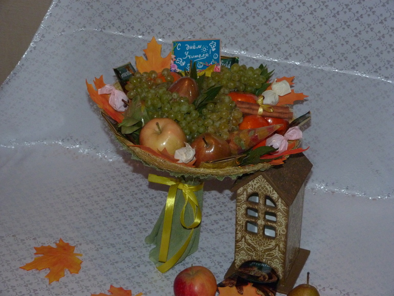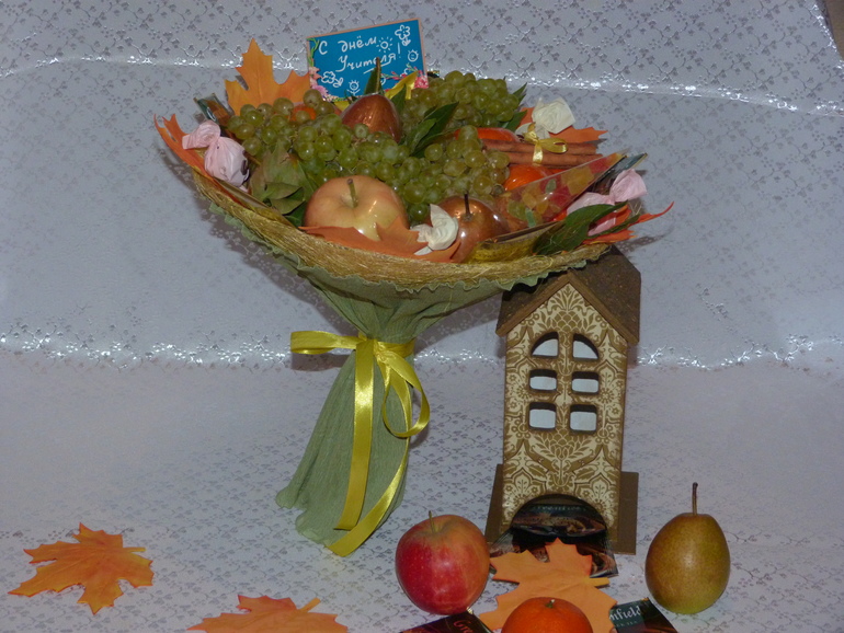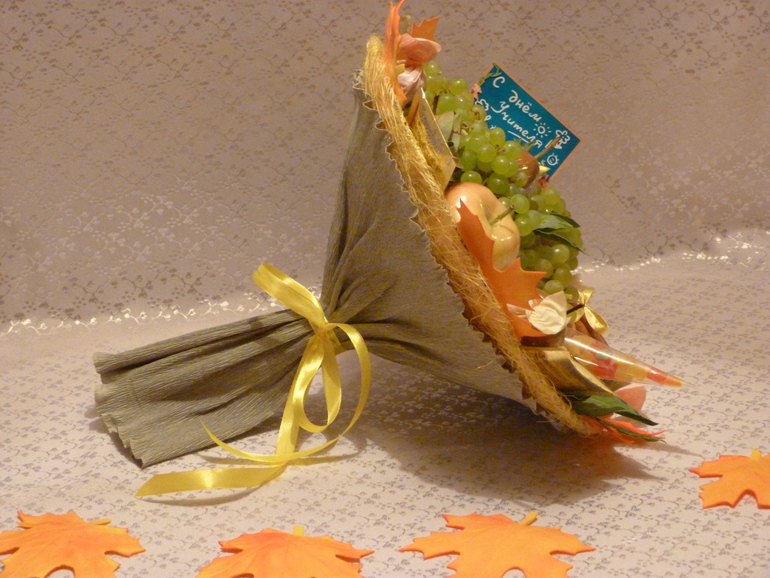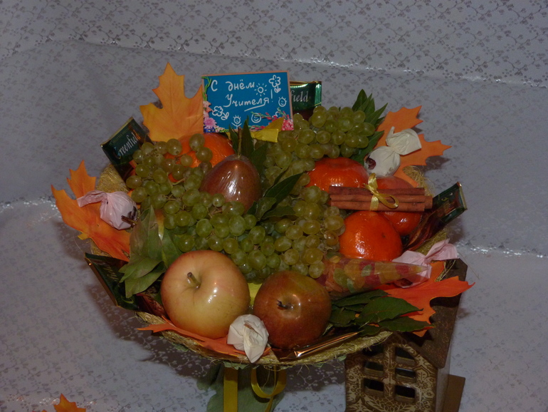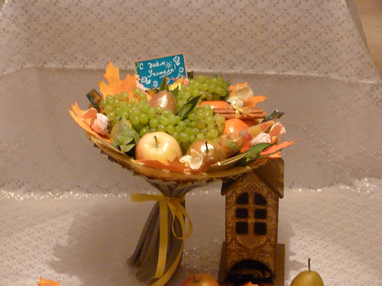 Букеты из конфет. Свитдизайн.Очень мне хотелось сделать букет из фруктов, благо и повод нашёлся. Вот он - мой первый !!! Под катом много фото, более 5.