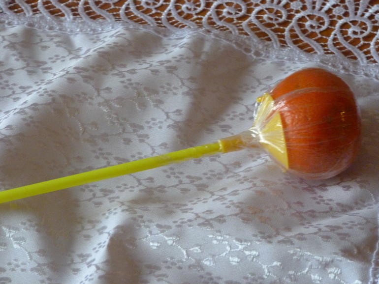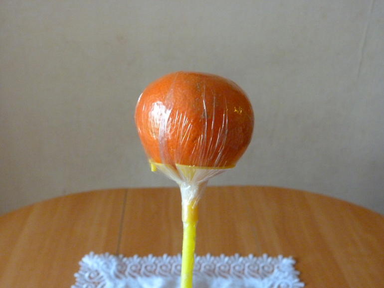 На палочках для шариков. В них - фрукт, сверху стрейч , а внизу туго скотчем. Вот фото :