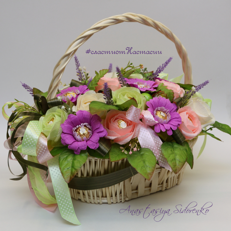 Корзина интересная. Банты необычно для корзины закреплены.