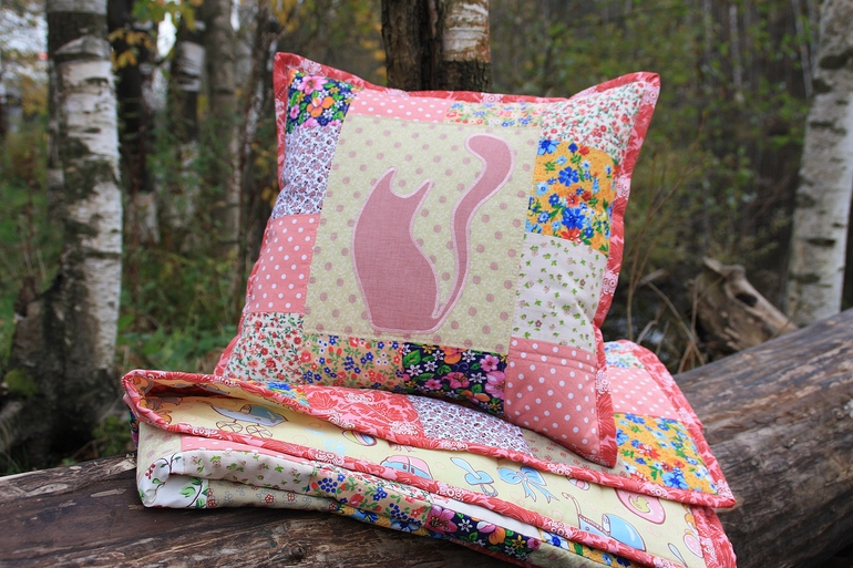 Чудесное одеялко! лоскуточек к лоскуточку и сложилась яркая красивая "полянка"))) уютный комплектик с подушечкой)) не броская аппликация с киской очень удачно смотрится :)))