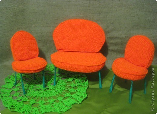 Я делала мебель лет 8 назад, для старшей дочки (как-то настало не на что кукол Барби садить). Теперь по наследству перешло к младшей. Глядя сейчас... переделала бы ножки, обвязала полностью... но если уж только снова совершу этот подвиг)))))))))))))))) Сидения - обвязанный поролон.