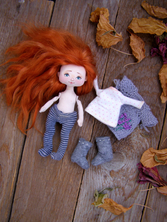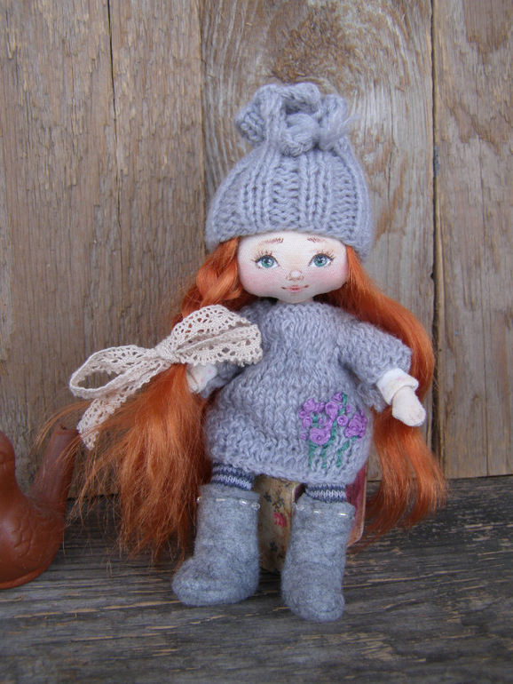 Кукольный мир - человекоподобные куклыЕщё малышка...шарнирная ...Рыжий ребеночек).. Всего 14см. Одета в в вязанное платьице , вязанную шапочку. На ножках валеночки. Одежка снимается. Волосы натуральные локоны козочки, проклеены и прошиты...можно расчесывать и делать прически. Личико расписано акрилом и маслом. Куколка подвижная, крепление пуговичное. Стоять не умеет, сидит красиво)).