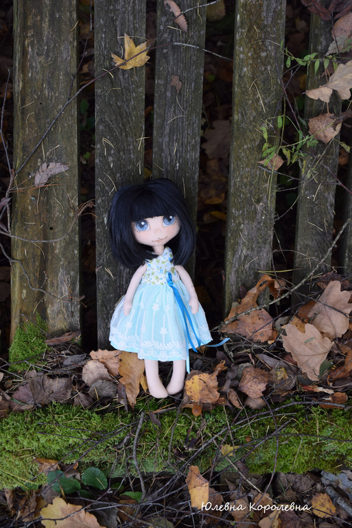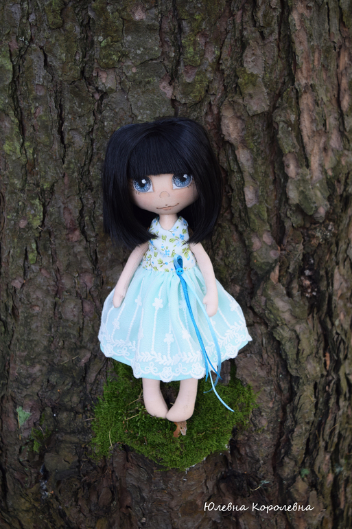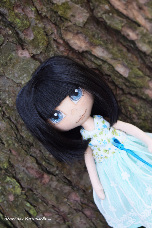 Такая вот девочка родилась. Изначально образа в голове не было, пришила трессы и решила сделать чёлочку, а потом и подстригла волосы)) Куколка ростом 25см, стоит на подставке или у опоры. Платьице снимается.