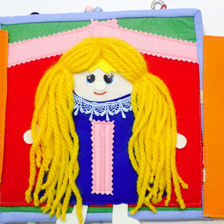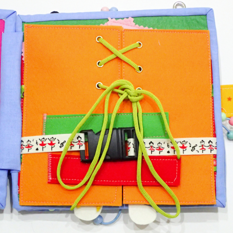 10 страниц, 45 съемных элементов, огромное количество пуговичек и бусинок порадовали малышку. А большое количество застежек отлично развивают мелкую моторику.