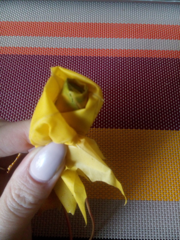 далее берем еще один лист, складываем так же пополам и обворачиваем нашу середину, формируя цветок