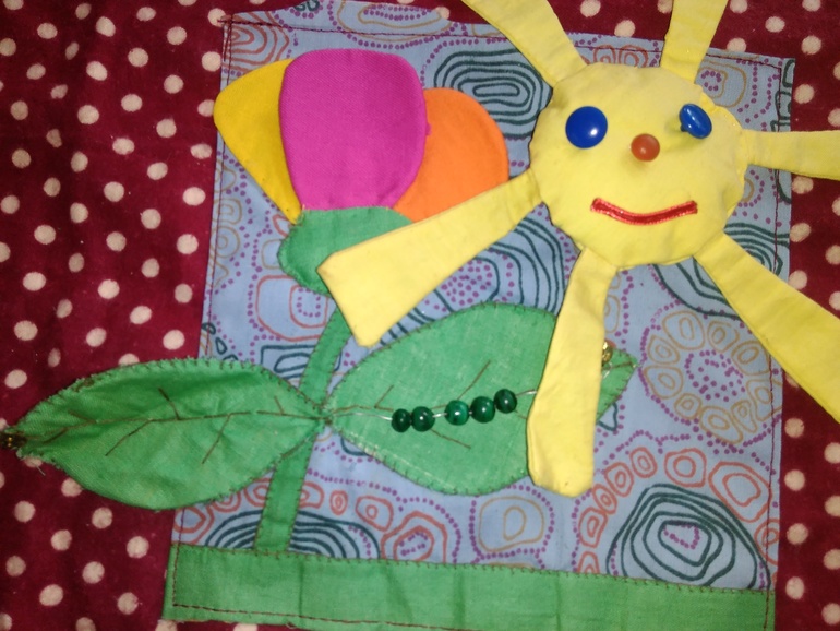 У божьей коровки замочек растягивается, крылышки шелестят, пятна (пуговицы) рассчитаны на тактильные ощущения и на обучение большой-маленький. Листик у цветка на кнопке, под листиком гусеница из бусинок на проволоке (можно перебирать и перекатывать), солнышко на липучке, можно заменить на тучку. У дерева и ёжика яблоки на липучке и можно переставлять туда и обратно
