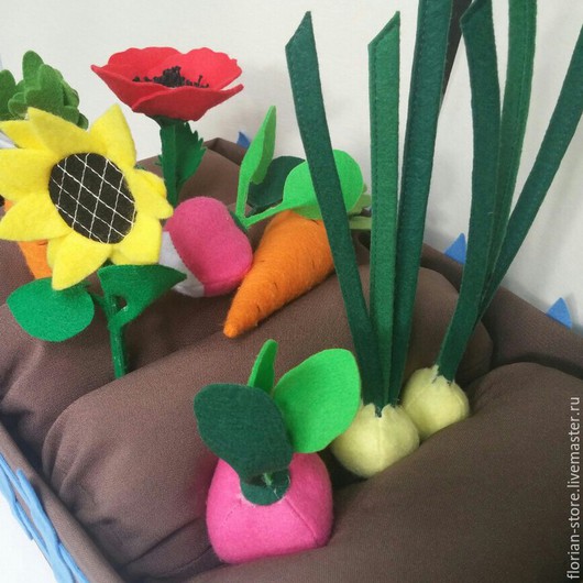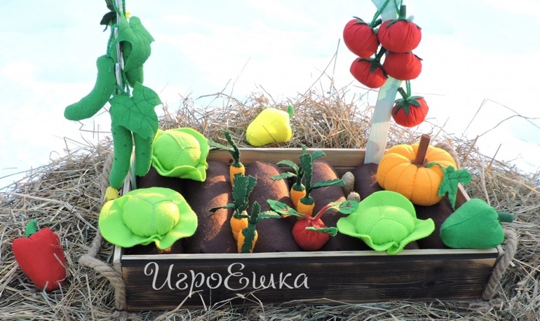 Можно из фетра овощи-фрукты, разную еду, кексики, бублики, а еще увидела "огород", мне очень понравилось, хочу своей дочке такое сшить
