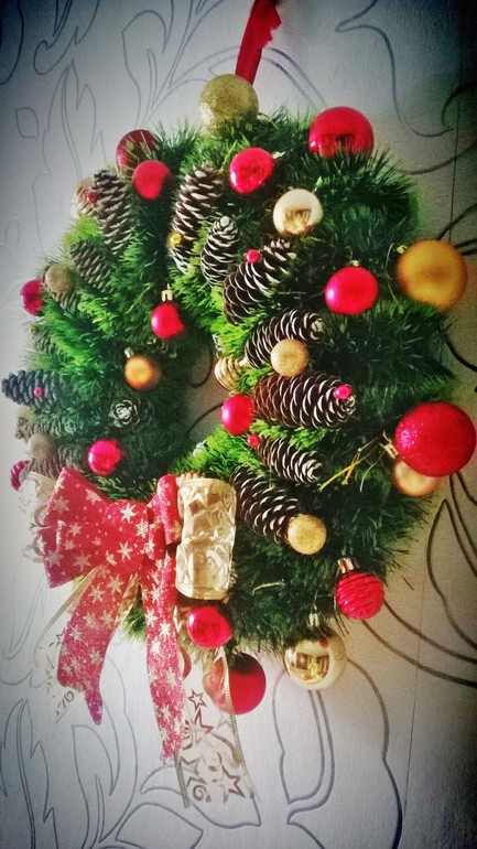 Вот такой новогодний венок делала в прошлом году. В красно - золотом цвете.)))Делала в первый раз и вот что получилось.))))))