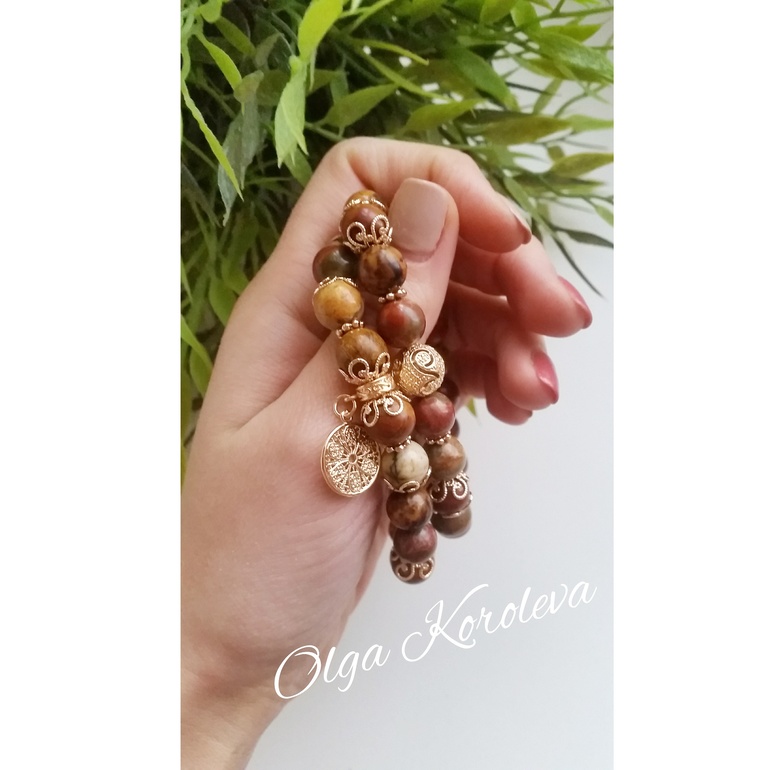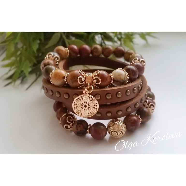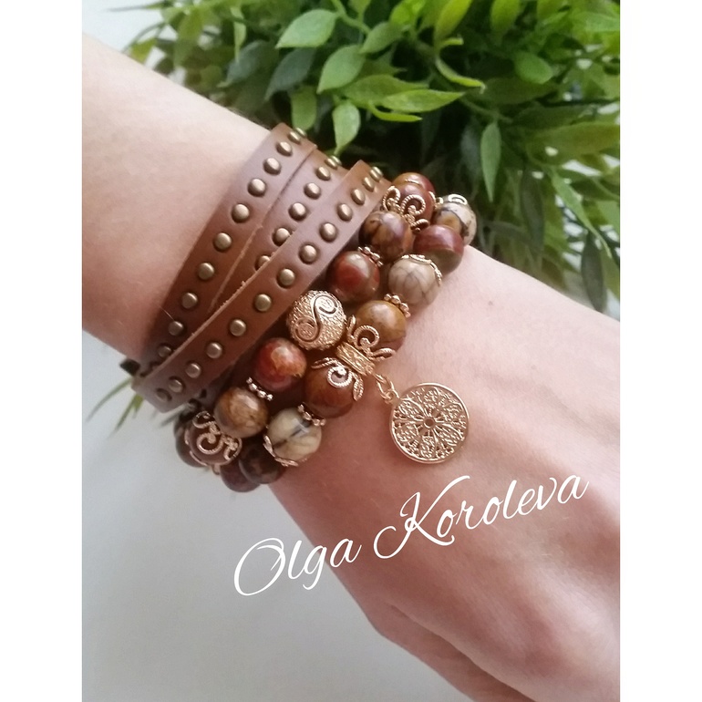Бижутерия для слингомам. Слингобусы. Грызунки.Каждую осень я делаю что-то из этого потрясающего камня. Богатый природный рисунок пейзажной яшмы не требует обилия фурнитуры, камни просят лишь немного подчеркнуть их натуральную красоту. Захотелось подружить браслеты из камней с кожаным браслетом-обмоткой, по цвету они идеально подошли друг к другу. Использована фурнитура класса люкс с позолотой, с ней украшения мне нравятся все больше и больше.