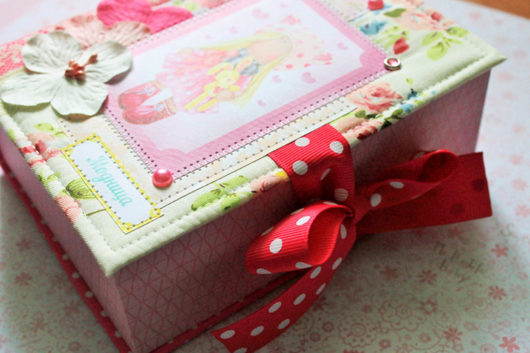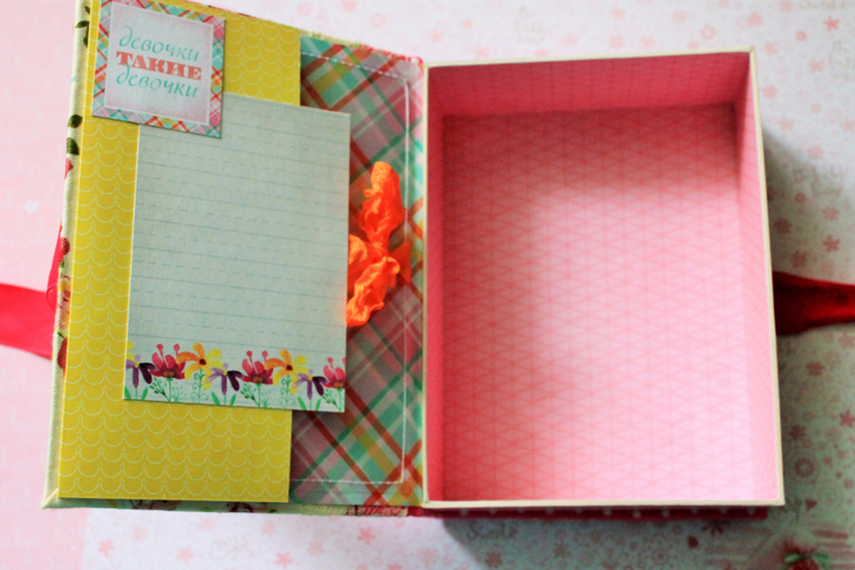 Блокнот закрывается на резиночку, а коробочка на бант из репсовой ленты