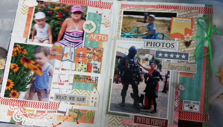 Альбом формата 18х25 см, 5 разворотов. Вместилось много фотографий разного формата-в альбоме много кармашков, тайников и дополнительных разворотов....