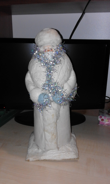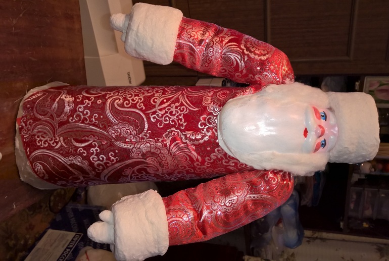 Вопрос/ответ, поиск схем, выкроек, советов, магазинов и т.дВсем привет! Девочки, есть Дед Мороз 60-70-х годов прошлого века))) Мы его очень любим всей семьей, он нам очень дорог) Поэтому хотелось бы как-то подлечить, обновить дедушку. На нем от времени появились пятна, кое-где оторвались ватные части. Там сама одежда - накрахмаленная ткань, а опушка на шубе, шапка - вата, покрытая чем-то (на ощупь - как глазурь). Дождик надо вообще убрать)) Чем его покрасить или может лучше тканью обклеить свежей? В общем, кто этим занимается или работает с подобными материалами, посоветуйте, пожалуйста, как лучше обновить бедного Деда Мороза?))