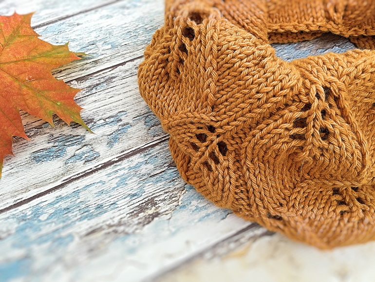 Снуд в один оборот с узором листочки, шапка самая простая