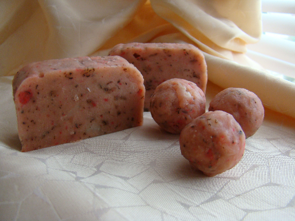 Сварено ГС. В составе НСЖК масел миндаля, какао, касторового, кокосового, пальмового, мякоть банана, сок свежей клубники, пигмент, отдушка банан, клубника. SF - 10% (масло абрикосовых косточек, ши).