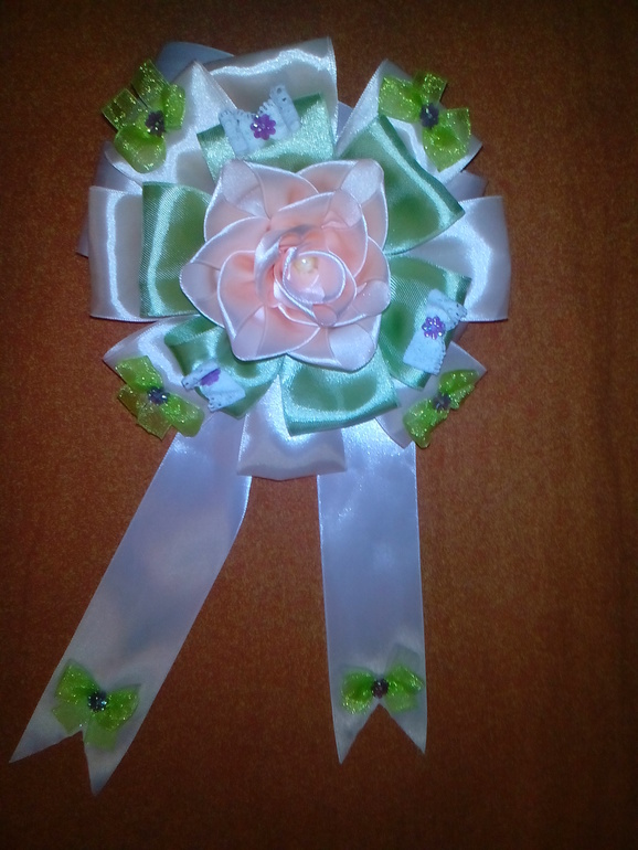 Цветы из ткани и форма. Канзаши. Украшения для волос.К конверту решила сделать бант на выписку. Знаю, что перебор, но свекровь настояла. Возможно, что не будем его завязывать. Но показать хочется.