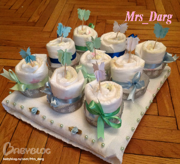 2. Пироженки из подгузников на подносе - поднос - это детское пастельное белье.