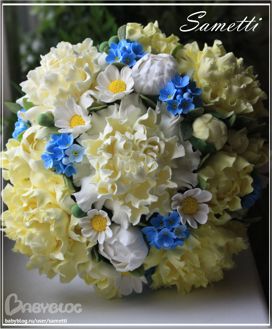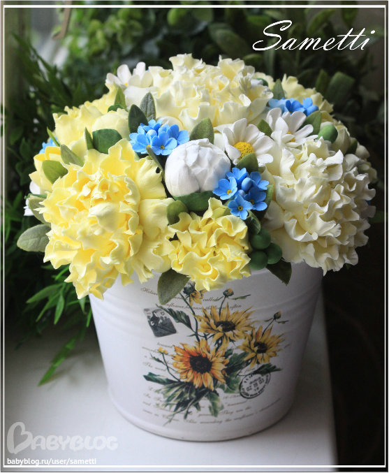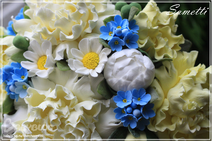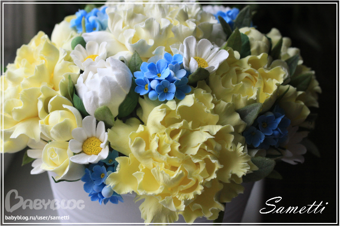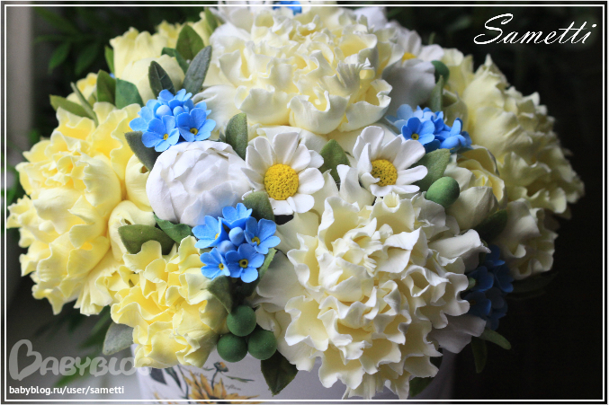 Пионы разной степени зрелости, от плотных бутонов до полностью раскрытых, полевые ромашки, незабудки, розочки.