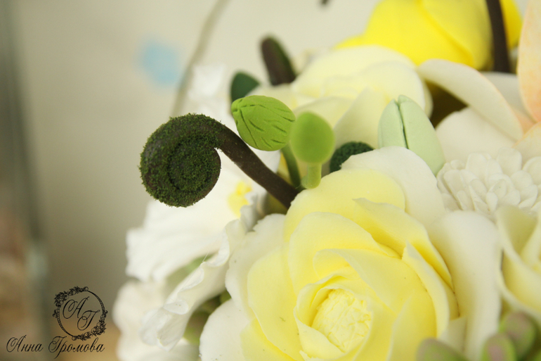 В букете: несколько сортов орхидей, ранункулюсы, побеги папоротника (пушистые и мохнатые) , гортензия, бутоны туберозы, пионы разных сортов, плюмерия (он же франжипан) , розы, пикаки, различные бутоны.