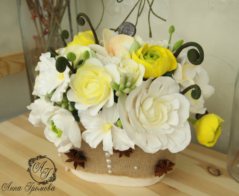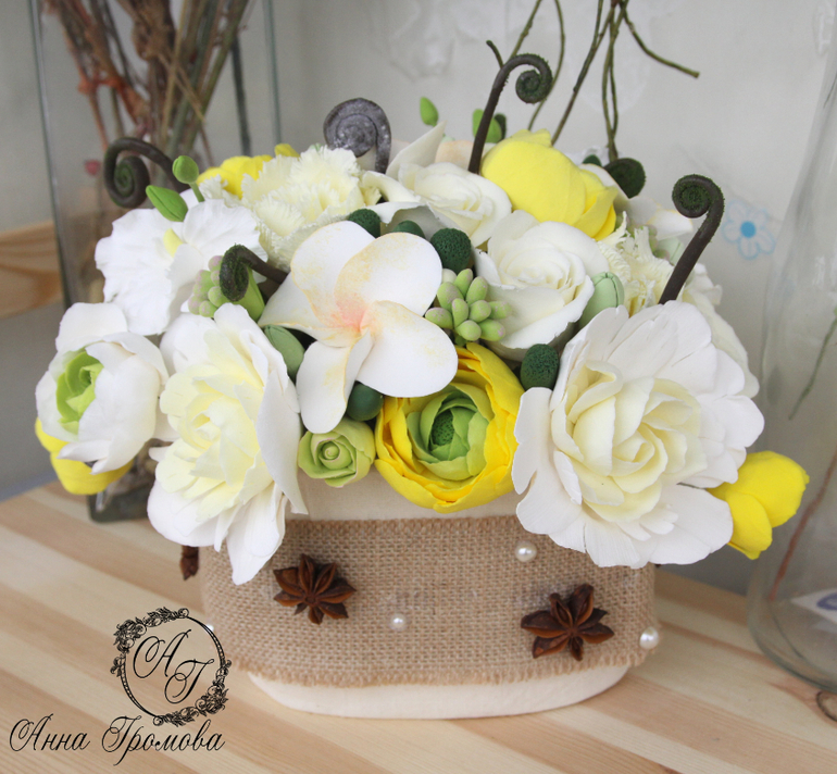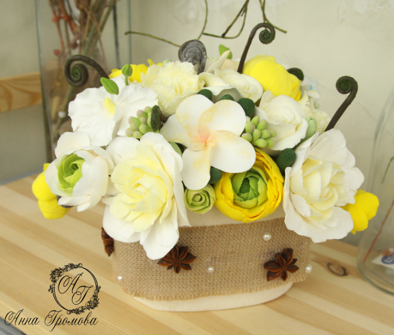 Поэтому кашпо делала вручную, обтянула льном и мешковиной, декорировала анисом ароматным и жемчужинками.