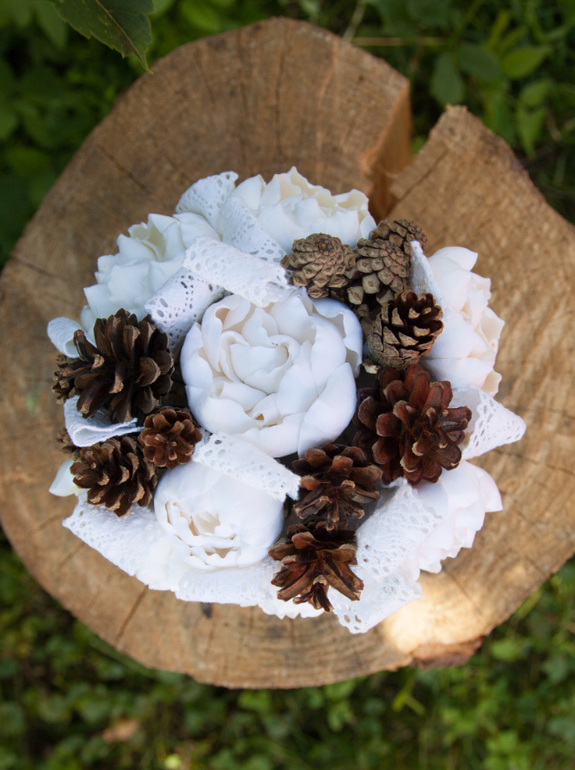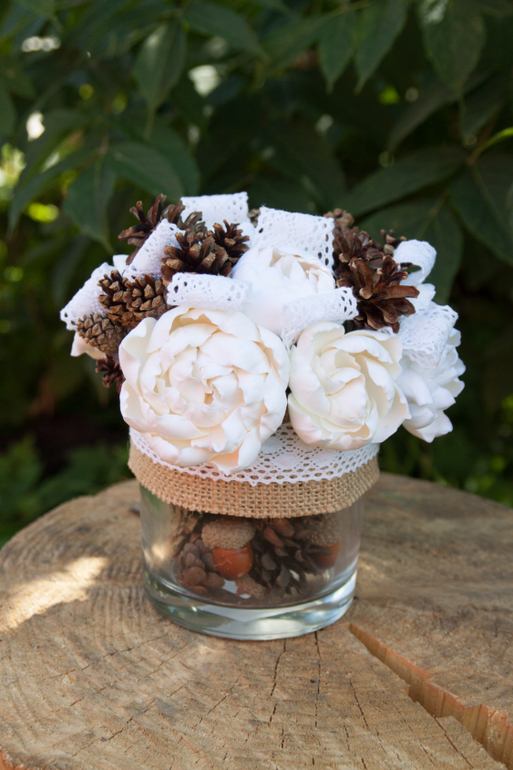 Букет ручной работы. Цветы сделаны из легкой глины, а стеклянное кашпо декорировано вручную мешковиной и кружевом :) Всегда любила это сочетание: простота и грубость с изысканной нежностью :) а в самой вазочке собраны дары леса: разные шишки и желуди)