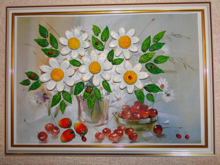 Солёное тесто (ТОЛЬКО ГОТОВЫЕ РАБОТЫ)Поленилась я рисовать фон! Нашла цветную распечатку и прям на нее приклеила ромашк, листочки и клубничку.