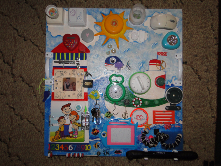 А теперь хвастаюсь нашей развивающей доской-бизибордом. В ней 30 развивающих элементов. дочка любит проводить возле нее время.